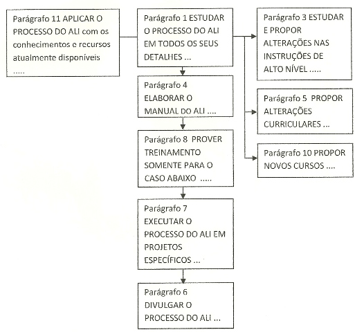 Essa ementa traduz um objetivo (aliás, de modo inadequado na redação de objetivos) que é diferente da intenção manifestada parágrafos acima. Portanto, não será implantado e implementado o processo do ALI na Marinha de guerra, mas sim um Núcleo com as finalidades declaradas na ementa (vide anexo ao final desse artigo).