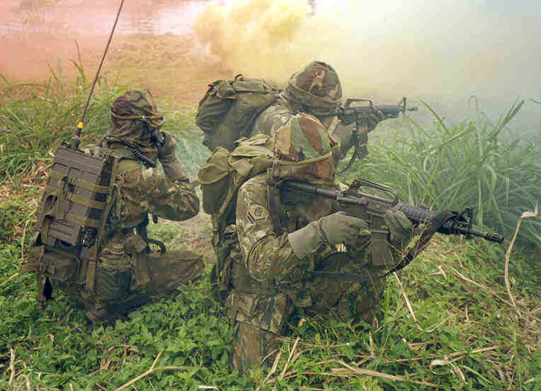 tanto na Amazônia, quanto no Pantanal Matogrossense; executado exercícios de retomada de navios, plataformas de petróleo e de resgate de reféns; e conduzido testes com armamento submarino. | ![]() |